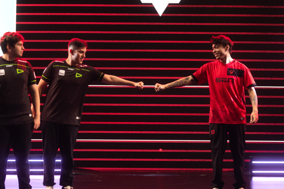 Capa: (L-R) Felipe "Less" Basso and Arthur "tuyz" Vieira of LOUD and Bryan "pANcada" Luna of Sentinels fist bump onstage before competing during Week 4 of 2023 VCT Americas at the Riot Games Arena on April 21, 2023. (Photo by Robert Paul/Riot Games)