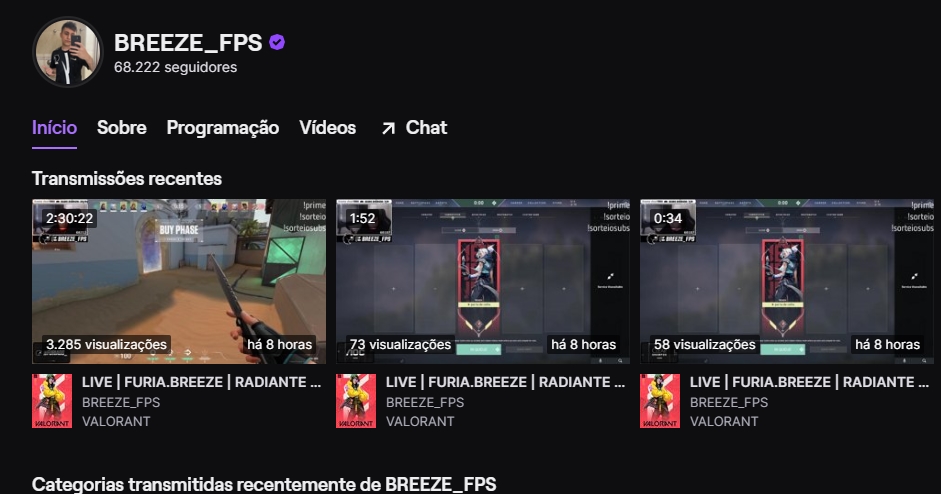 Streamer oficial da FURIA, Breeze_FPS conta com quase 70 mil seguidores na Twitch. Radiante no FPS da Riot Games, ele é um dos principais nomes da modalidade no país, com uma gameplay interessante para quem mira o profissional.