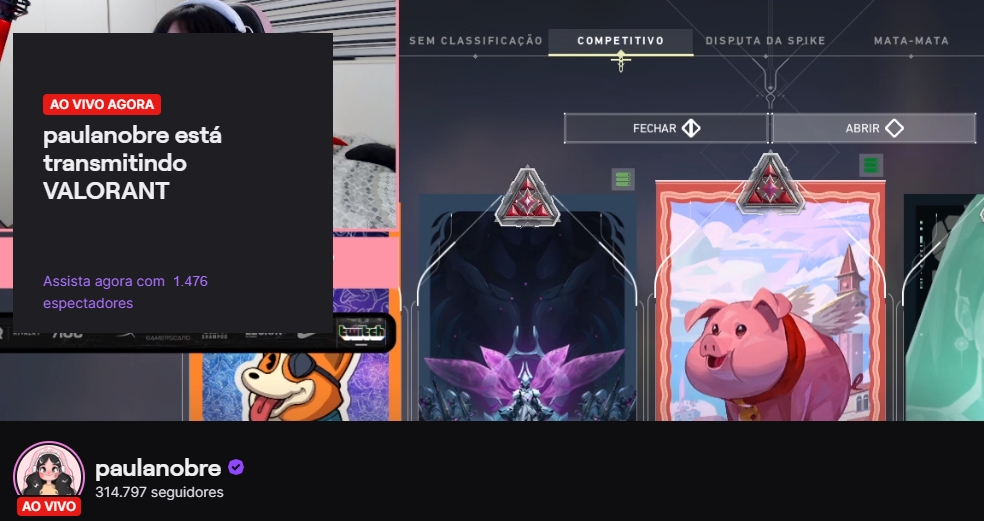 Rumo ao Radiante, Paula Nobre arrasta uma multidão de seguidores na Twitch. Com mais de 300 mil seguidores, é um dos streamers mais populares do Brasil no FPS da Riot Games. Com jogos de alto nível, Paula consegue mostrar boas dicas de como ser competitiva no jogo.