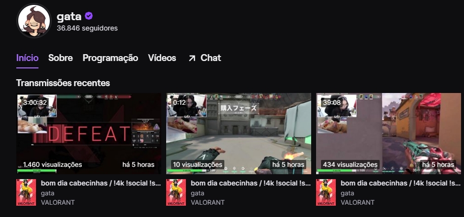Com mais de 37 mil seguidores na Twitch, Gata foge do tradicional e deixa uma câmera apontada para a(o) gatinha(o) de estimação enquanto faz a transmissão. Ainda assim, é uma excelente fonte de conteúdo de VALORANT na plataforma de streaming.