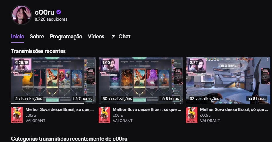 Com quase 9 mil seguidores na Twitch, Jéssica “c00ru” Reinherdt é mais uma excelente opção para curtir na plataforma. Também com bom humor, se define como “a melhor Sova” do Brasil. Por isso, não se espante se vê-la jogando com o agente diversas vezes seguidas.