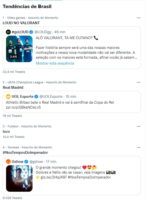 Menos de uma hora após anunciar a line-up de VALORANT, a LOUD entrou nos trending topics do Twitter, que são os assuntos mais comentados. No Brasil, a tag “LOUD NO VALORANT” teve mais de 36 mil menções e liderou a lista no Brasil.