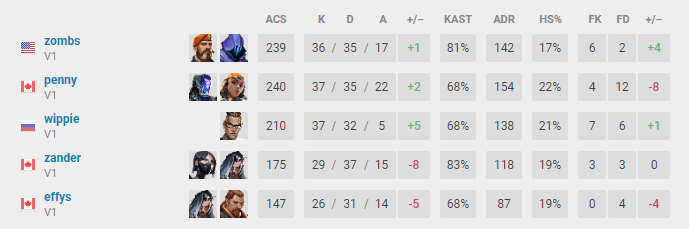 No confronto, a V1 perdeu para a TSM por 2 a 0. Apesar disso, zombs terminou como top fragger da Version1 com 36 eliminações, jogando de Brimstone e Omen.