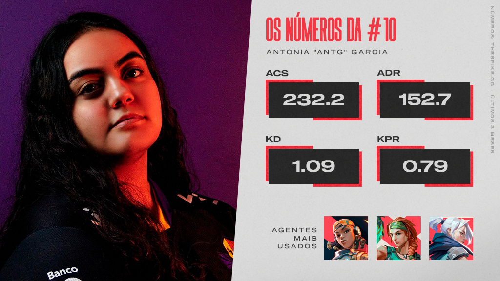 Como já dito, ela tinha na Raze, Skye e Jett os agentes prediletos para que, como ela mesma disse pudesse “chegar e amassar” as adversárias. Não por menos, terminou a temporada competitiva com um ACS médio de 232,2, um dos mais altos dentre todas as jogadoras que fazem parte da lista do VALORANT Zone.