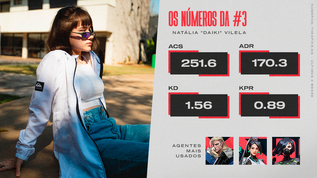 Natália Vilela somou mais de 251 de ACS (pontuação média de combate), 170 de ADR (dano médio por round), 1.56 de KD (Eliminações/mortes), enquanto registrou 0.89 de KPR (Kill por Round), de acordo com os números coletados thespike.