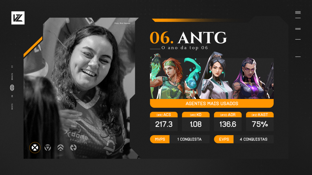 Permanecendo na lista pelo segundo ano consecutivo, Antônia mostrou durante o ano uma grande resiliência, sabendo onde focar para manter o nível de seu time elevado e batendo de frente com as melhores do cenário. Não é atoa que antG foi indicada ao premio de Melhor Atleta Feminina de VALORANT de 2022. E como não seria diferente, a player também aparece na lista do VALORANT Zone ocupando o 6º lugar entre as Melhores do Ano.