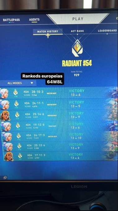 O atleta compartilhou seu histórico de partidas e revelou que até o momento venceu 64 partidas e perdeu somente oito. Com os números, aspas atingiu o Radiante e está na posição 54 das ranqueadas do velho continente.
