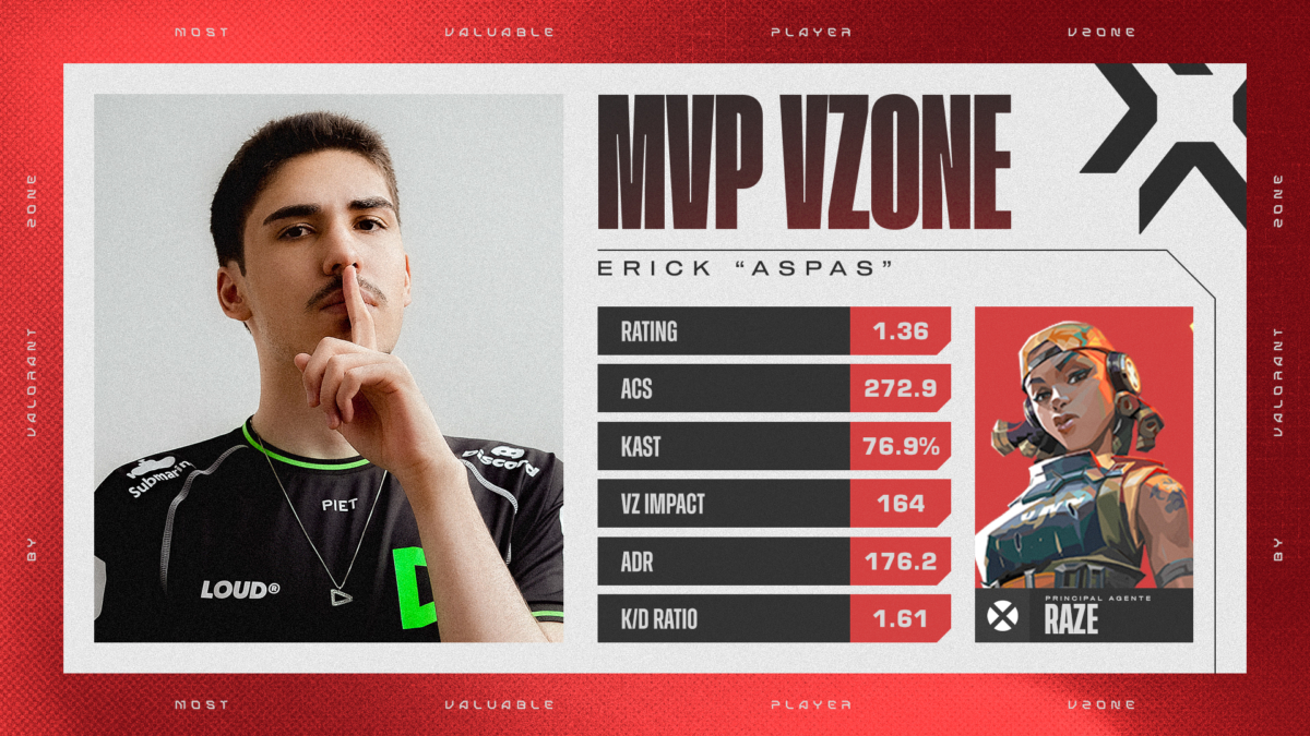 aspas teve números dominantes durante toda a competição, a qual fechou com rating de 1.36 do thespike e VZ Impact de 164 – ambos os maiores desta etapa do VCB. Já na pontuação média por combate (ACS) foi 272.9, média de dano por round (ADR) de 176.2, o K/D de 1.61, média de kill por round (KPR) de 0.96 e o KAST foi de 76.9%.]