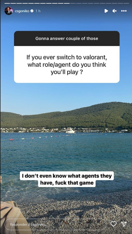 Em pergunta feita nos stories de seu Instagram, um seguidor de NiKo questionou qual seria o agente que o bósnio escolheria jogar, caso um dia migrasse para o VALORANT. A resposta foi a seguinte: “Eu nem sei quais agentes eles possuem, fod#-se o VALORANT.”
