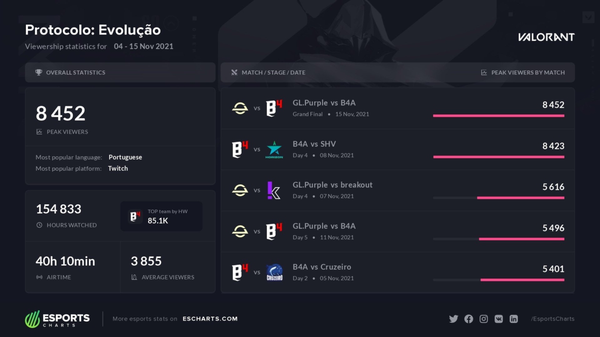 Segundo o Esports Charts, o Protocolo Evolução, o circuito classificatório para o Game Changers Series Brasil 2, superou em questão de visualizações o Finest Invitational que contou com Natus Vincere, Alliance, Movistar Riders e outras equipes. O torneio brasileiro teve 7,5 vezes mais horas assistidas e quase 4 vezes mais de média de espectadores.