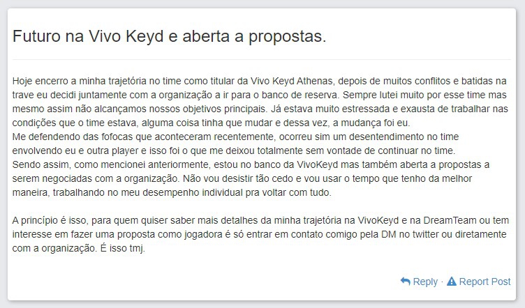 “Hoje encerro a minha trajetória no time como titular da Vivo Keyd Athenas. Depois de muitos conflitos e batidas na trave eu decidi, juntamente com a organização, ir para o banco de reserva. Sempre lutei muito por esse time, mas mesmo assim não alcançamos nossos objetivos principais. Já estava muito estressada e exausta de trabalhar nas condições que o time estava, alguma coisa tinha que mudar e dessa vez, a mudança foi eu”, revelou a jogadora.