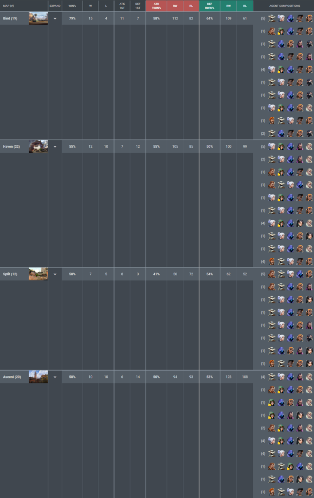 Segundo as estatísticas do vlr, Bind é, de longe, o mapa no qual a Nimo oNe tem o melhor aproveitamento: 79% conquistados em 19 partidas, com 15 vitórias e quatro derrotas. Na sequência, 58% em Split (7v e 5d), 55% na Haven (12v e 10d) e 50% (10v e 10d)