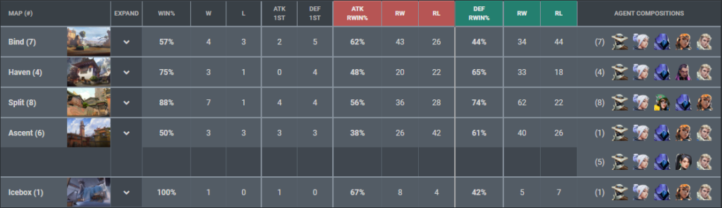 De acordo com os números do vlr, Split é o melhor mapa da equipe. O aproveitamento é de 80%, com sete vitórias em oito oportunidades. Na sequência vem Haven (75%), Bind (57%) e Ascent (50%).
