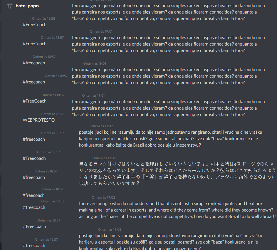 Participantes usaram o meio de comunicação do torneio para spamar mensagens no bate-papo do canal, a começar pelo #freecoach, como forma de protesto a não liberação do slot do coach nas partidas, seguindo para um jogador baitando ao falar que o problema na plataforma foi solucionado até que todos “perderam a paciência” e começaram a mandar as mesmas falas de forma repetida.