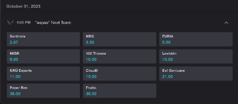 Segundo o mercado aberto no site para apostar no futuro time do atleta, a Sentinels aparece como favorita, com odd 2.87. Entre as organizações brasileiras, a FURIA aparece com odd 5.50 e o MIBR com odd 9.00. FNATIC e Paper Rex aparecem como as opções improváveis, com odd 36.00