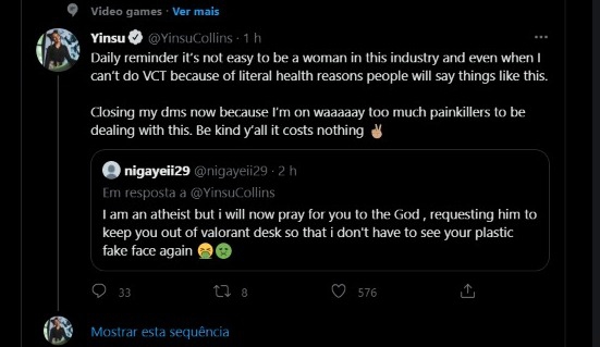 “Lembrete diário que não é fácil ser uma mulher nesta indústria e mesmo quando eu não consigo apresentar o VCT por, literalmente, questões de saúde, pessoas dirão coisas como essa. Fechando minhas DMs agora porque eu estou sob o efeito de muuuuitos analgésicos para estar lidando com isso. Sejam gentis galera, não custa nada.”