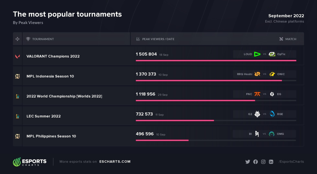 O VALORANT Champions 2022 foi o torneio de esporte eletrônico com maior pico de audiência no mês de setembro. Os números apresentados pelo Esports Charts apontaram que a competição conseguiu atrair pouco mais de 1,5 milhão de dispositivos conectados simultaneamente.
