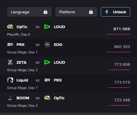 Os dados são do portal Stream Charts, que mostra que a torcida brasileira apoia fielmente a equipe esmeraldina. Dos cinco jogos com maior audiência ao longo do Champions 2022, dois são da LOUD. Além da partida dessa sexta, o jogo entre o time brasileira e a ZETA Division alcançou mais de 770 mil espectadores simultâneos.