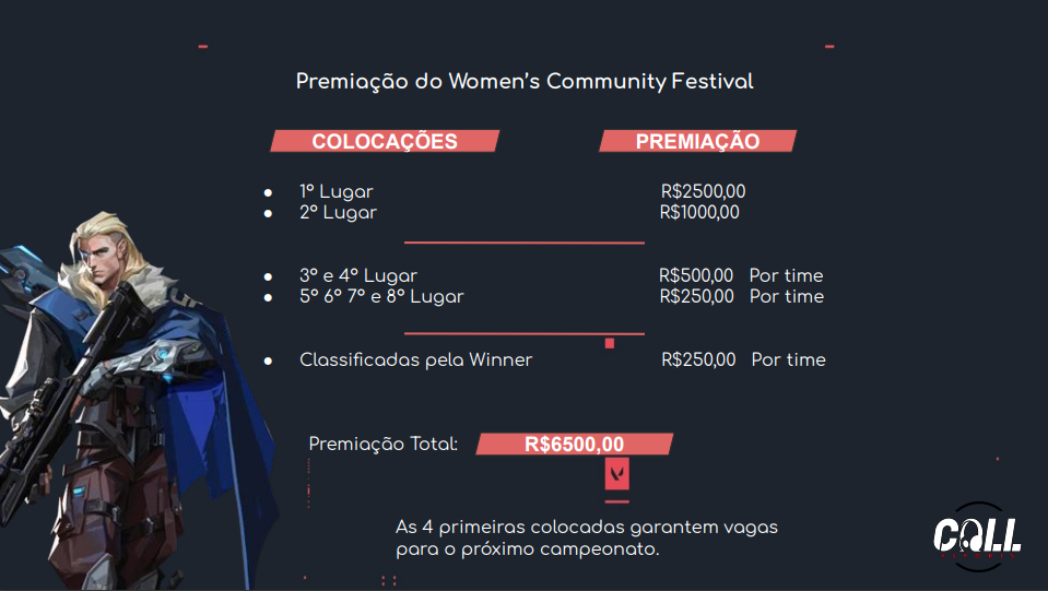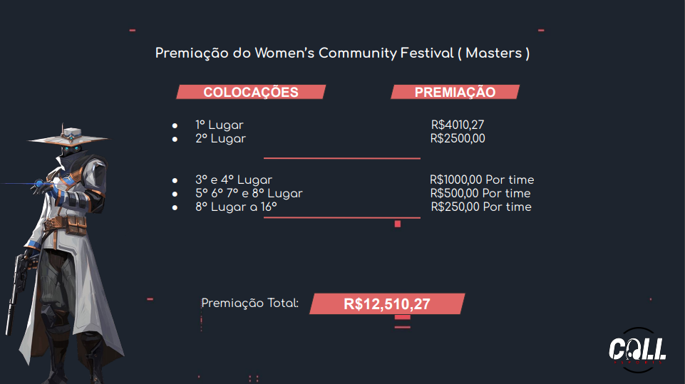 Women’s Community Festival e Women’s Community Festival Masters terão premiação total de R$ 19.010. O primeiro terá R$ 6,5 mil em prêmios distribuídos entre as oito primeiras colocadas, enquanto a Masters tem a quantia de R$ 12.510, 27 para toda as 16 participantes. Além disso, as duas competições terão seletivas abertas.