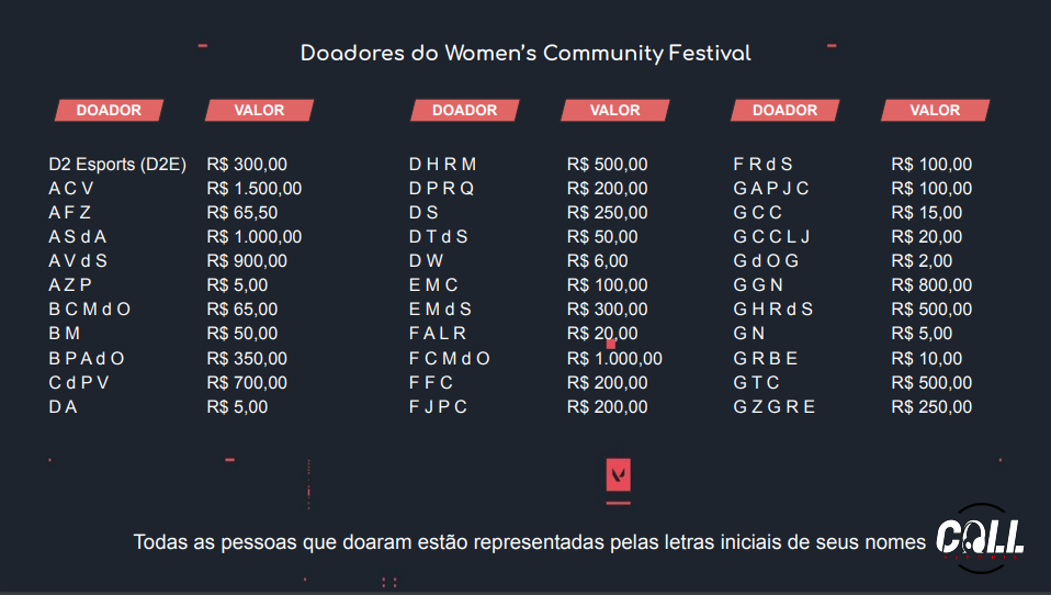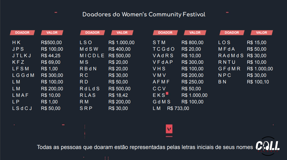 Grandes nomes do VALORANT e personalidades dos esports no geral ajudaram na arrecadação, como Hernan “hastad” Klingler e Gustavo “Sacy” Rossi fizeram doações de R$ 500, cada.