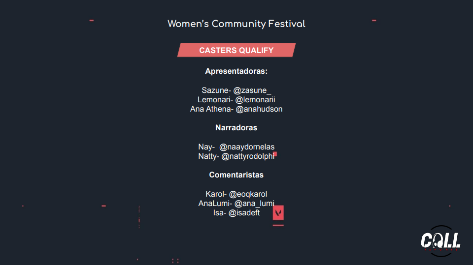Os jogadores poderão transmitir as próprias partidas na seletiva, enquanto no torneio principal apenas mulheres que se inscreverem junto ao comitê organizador. Também haverá transmissão oficial no canal da Call Esports.