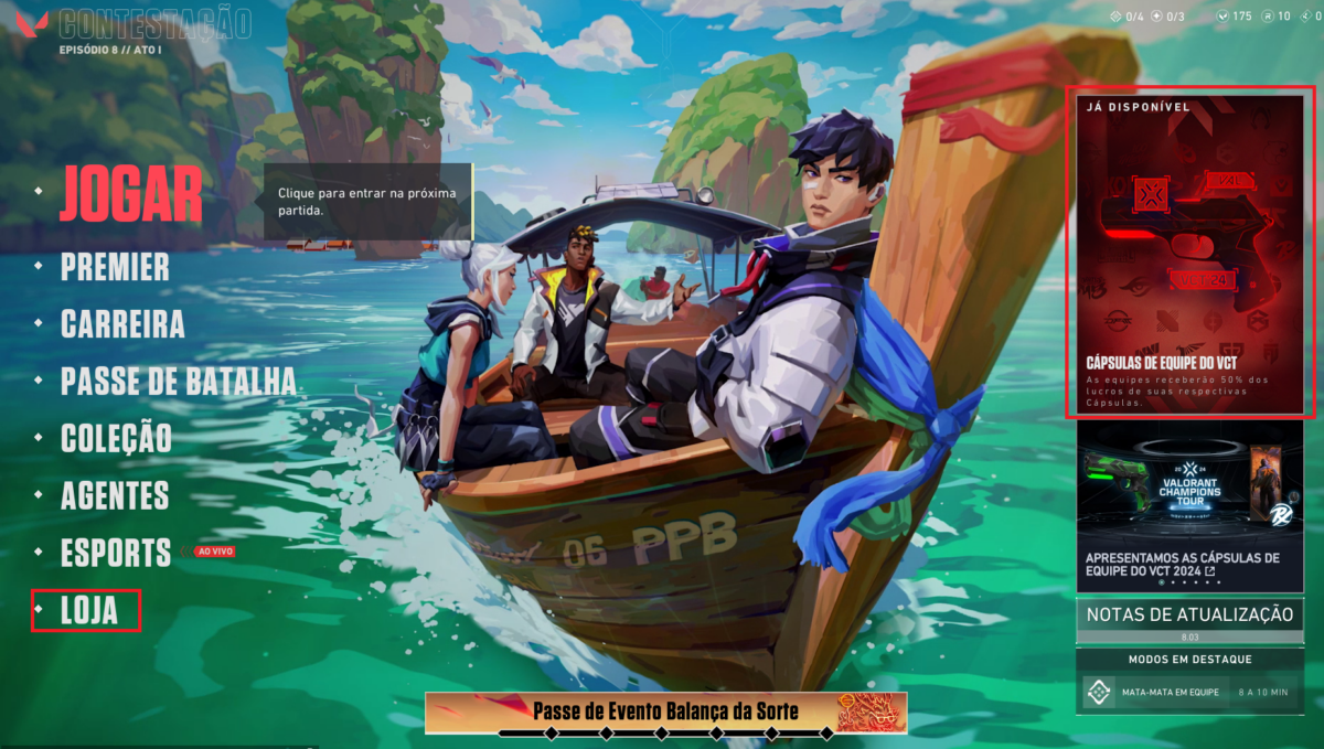 - Abra o VALORANT e vá até a aba da loja, ou clique no banner das cápsulas do VCT na página principal.