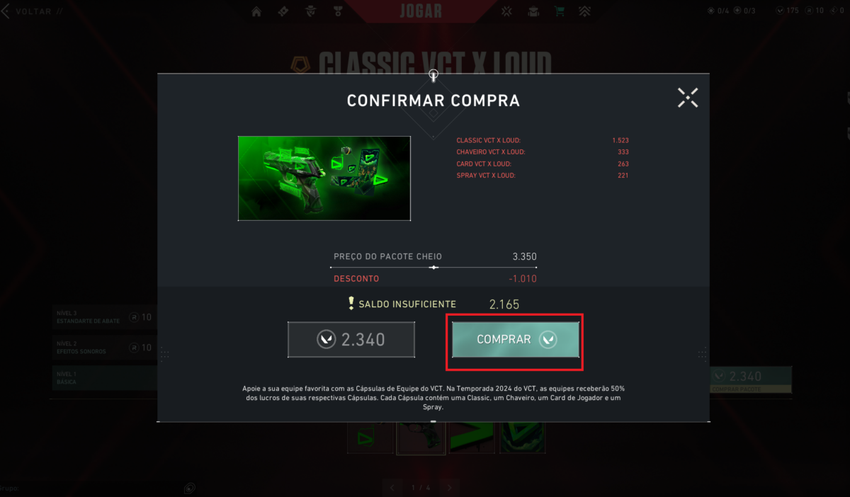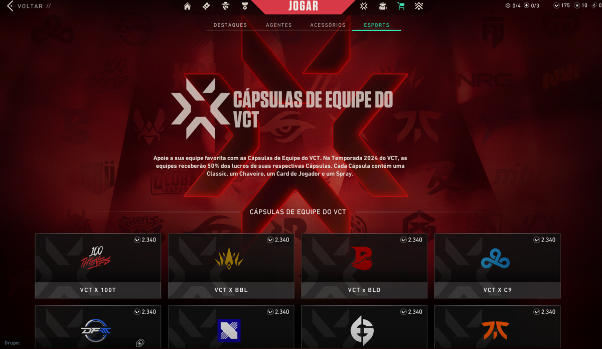 - Clique no destaque das Cápsulas de equipe do VCT. Cada pacote de skin, chaveiro, spray e banner custa 2.340 VALORANT Points (VP), que dá aproximadamente R$ 151,80. Será necessário comprar dois pacotes de VP, um que de 2.300 (R$ 74.90) e de 400 (R$ 16,90).