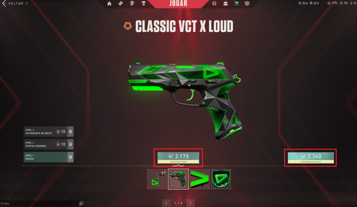- Escolha a equipe que você quer comprar a skin e selecione. Na página, você poderá comprar o pacote completo ou os itens separados. A skin Classic custa 2.175 VP, spray por 325, card por 375 e chaveiro por 475.