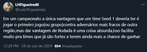 “Em um campeonato, a única vantagem que um time seed #1 deveria ter é jogar o primeiro jogo contra adversários mais fracos de outra região. Dar vantagem de rodada é uma coisa absurda, isso facilita muito pra times que já são fortes a terem ainda mais a chance de ganhar”, opinou um torcedor na plataforma X (antigo Twitter).