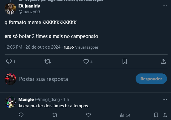 “Que formato meme, era só colocar mais dois times no campeonato”, disse outro torcedor na mesma plataforma. “Já era pra ter dois times brasileiros há muito tempo”, completou outro usuário.