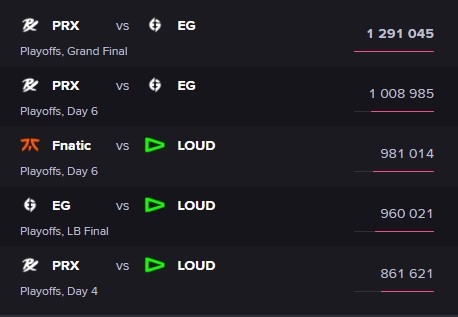 Na decisão do Champions 2022 entre LOUD e OpTic Gaming, mais de 1,5 milhão de espectadores simultâneos assistiram a equipe brasileira levantar o troféu. Na grande final do VCT LOCK//IN, realizada no início deste ano, mais de 1,4 milhão de espectadores viram a FNATIC derrotar a LOUD.