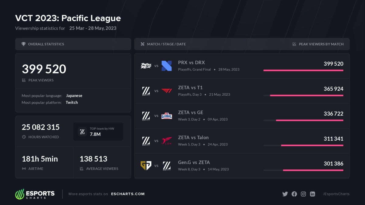A primeira edição de todos os VCTs regionais chegou ao fim neste domingo (28). No caso do VCT Pacífico, a Paper Rex venceu de virada por 3 a 2 a DRX. Segundo o Esports Charts, a final foi a partida mais popular de toda a competição com mais de 399 mil espectadores.