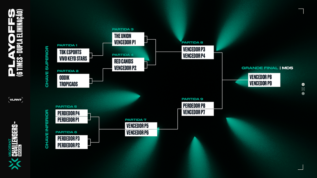 Os classificados foram The Union, RED Canids, ODDIK, TBK, Vivo Keyd Stars e TropiCaos. A 00Nation e a Liberty ficaram nas duas últimas posições e estão de fora do mata-mata. Os playoffs começam nesta terça-feira (14) e a grande final será domingo (19). Confira abaixo o cronograma completo do VCB: