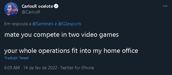 Na sequência, foi a vez de Ocelote provocar a Sentinels. O dono da G2 respondeu a publicação da organização norte-americana dizendo “amigo, você compete só em dois jogos. Toda sua parte administrativa cabe no escritório que eu tenho em casa”.