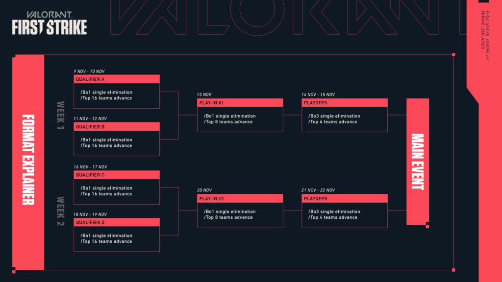 A etapa principal do VALORANT First Strike europeu está marcada para ocorrer entre os dias 3 e 6 de dezembro. Suas etapas de quartas de final e semifinais serão disputadas em MD3 de eliminação simples, enquanto a grande final será MD5. Por sinal, a decisão terá a MD5 já com o novo mapa Icebox.