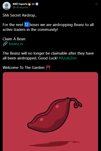 Além disso, há uma publicação fixada falando sobre um “secret airdrop” e que nas próximas 72 horas, “nós vamos dropar Beanz para todos os traders ativos na comunidade“.