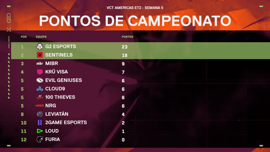 Após vencer a LOUD no último domingo (17), o MIBR chegou a nove pontos na tabela de classificação do VCT Americas e está em terceiro colocado no momento, atrás de G2 Esports e Sentinels. Vale destacar que estas duas equipes não podem ser ultrapassadas em hipótese e alguma e, por isso, já estão matematicamente garantidas no Champions.