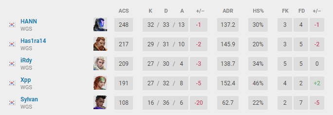 Apesar da coragem, a WGS acabou perdendo por 2 a 0. No primeiro mapa, Bind, a composição não funcionou defensivamente e acabaram sendo derrotados por 13 a 4. Já na Ascent, a partida foi mais disputada. Chegaram a virar a primeira metade vencendo por 8 a 4. Entretanto, novamente o lado defensivo não funcionou e acabaram perdendo por 13 a 10.