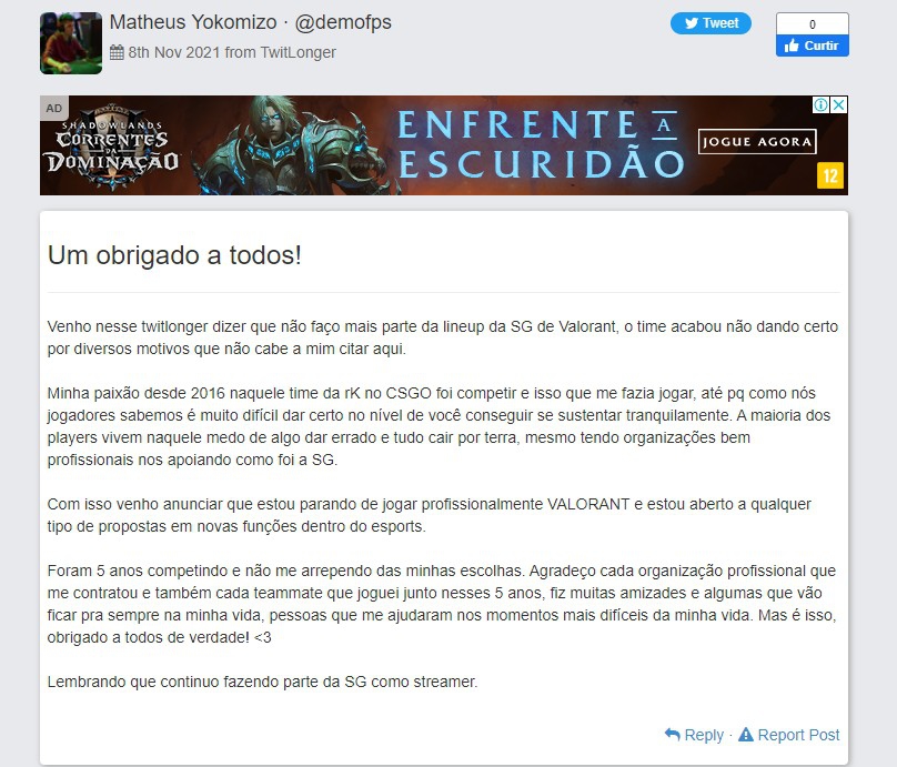 “Venho dizer que não faço mais parte da lineup da SG de VALORANT. O time acabou não dando certo por diversos motivos que não cabe a mim citar aqui. Minha paixão desde 2016 naquele time da rK no CS:GO foi competir e isso que me fazia jogar, até porque como nós jogadores sabemos é muito difícil dar certo no nível de você conseguir se sustentar tranquilamente. A maioria dos players vivem naquele medo de algo dar errado e tudo cair por terra, mesmo tendo organizações bem profissionais nos apoiando como foi a SG“, escreveu