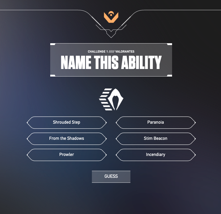 Cada tela possui um desafio diferente para testar o conhecimento do jogador sobre VALORANT. Os modos de jogo são propostos aleatoriamente à medida que o jogador avança nas fases. Contudo, na tela inicial, também é possível escolher o modo que queira jogar, dentre eles: questões sobre habilidades, mapas, sons e formação de palavras.