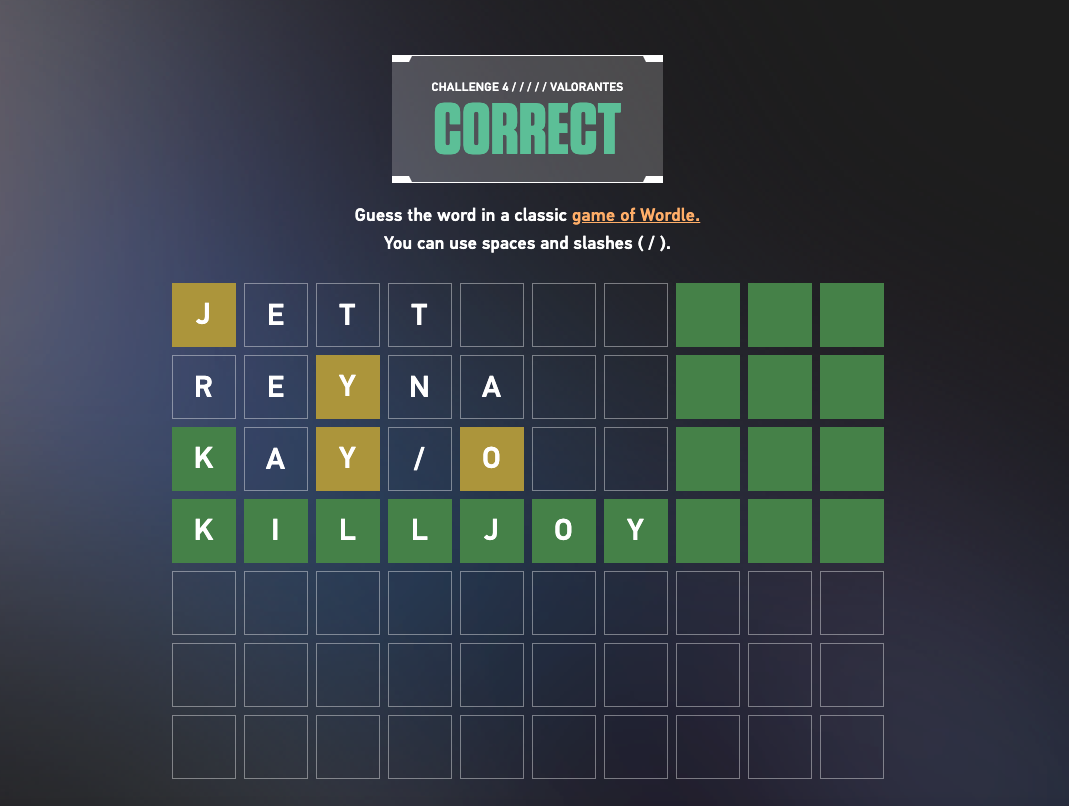 O Wordle é uma versão programada para web dos caça-palavras comumente encontrados em jornais e revistas. Entretanto, o VALORANTES não se limita apenas em achar/formar palavras. O mini game possui todo um sistema próprio de quiz, adivinhação e até mesmo desafios envolvendo efeitos sonoros encontrados no VALORANT.