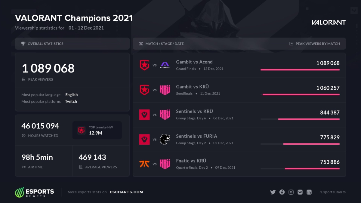 O segundo jogo mais assistido foi a semifinal entre Gambit e KRÜ Esports, com 1.060.257. A equipe do LATAM esteve presente em três das cinco partidas mais assistidas do mundial. O terceiro jogo foi Sentinels e KRÜ, que já tinha batido o pico de espectadores do Masters Berlin. Em 4° lugar foi o jogo entre os norte-americanos contra a FURIA e, em último, foi Fnatic e KRÜ.