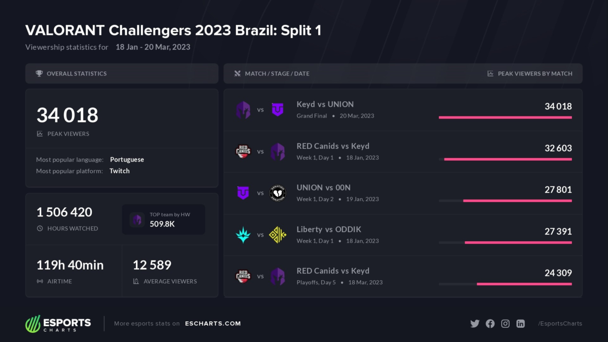 A 1ª etapa do VALORANT Challengers Brasil 2023 (VCB) chegou ao fim com a vitória da The Union pra cima da Vivo Keyd Stars. O duelo final foi o mais popular da competição inteira. Segundo o Esports Charts, a partida teve um pico de mais de 34 mil espectadores.