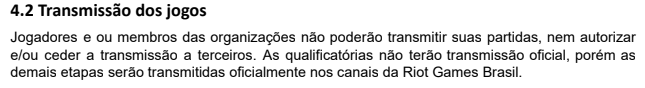 Segundo as regras do First Strike brasileiro, é proibido transmitir as partidas nas seletivas, como mostra o trecho abaixo: