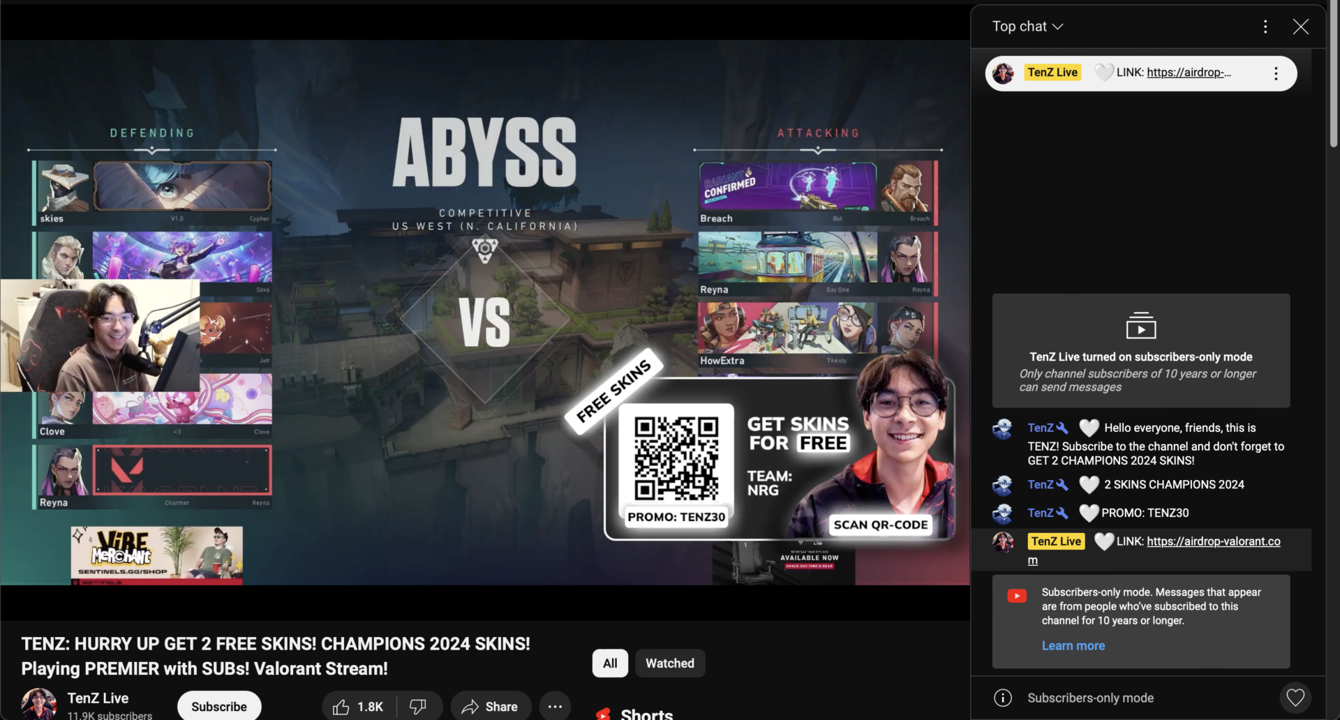 Um canal no YouTube chamado TenZ Live ou @tenzliveus, com mais de 12,7 mil inscritos, transmitiu uma live falsa do jogador profissional de VALORANT, Tyson “TenZ” Ngo, prometendo skins grátis para quem clicasse em um link malicioso. A transmissão chegou a ter mais de 4 mil espectadores simultâneos, muitos dos quais caíram no golpe.