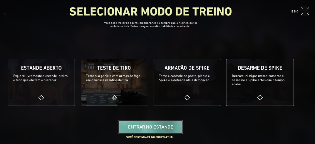 Estande aberto: opção que dá ao jogador o direito de explorar Range e, consequentemente, as funções presentes no mapa de treino. Lá, poderá assumir o controle de todos os agentes e usar todas as armas.