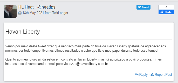 heat estava na Havan Liberty desde o fim de fevereiro, quando foi contratado para substituir Pedro “pMdr1″ Henrique, que deixou o clube também naquele mês.