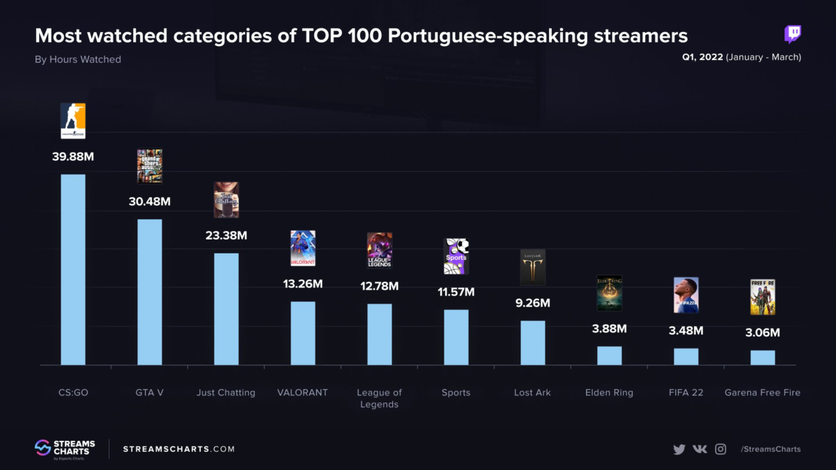 Os números apresentados pelo Stream Charts também apontaram que VALORANT foi uma das modalidades mais assistidas na plataforma durante este período. O jogo da Riot Games conseguiu acumular 13,26 milhões de horas assistidas com o público brasileiro.