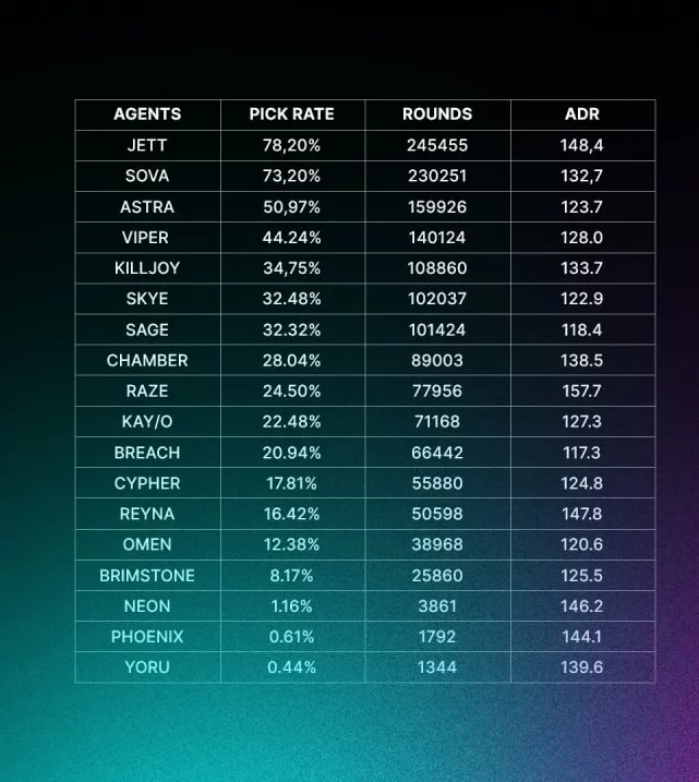 Enquanto a duelista ocupa o primeiro lugar com 78,20% de escolha, o iniciador russo marcou presença em 73,20% das partidas competitivas. Ambos os agentes possuem taxas de escolha muito acima dos que vem em seguida, com mais de 20%. No total, a Jett apareceu em 245455 rounds, enquanto Sova apareceu em 230251.