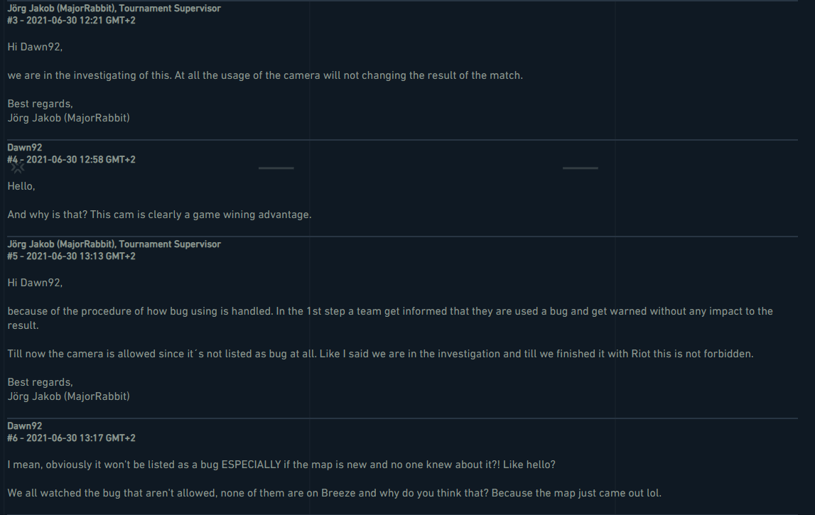 Na conversa do jogador com o administrador, o supervisor revelou que estavam investigando o bug. “Oi Dawn92, estamos investigando, mas o uso da câmera não irá mudar o resultado da partida”, disse o supervisor. Em seguida o jogador rebateu. “E por que isso? A câmera é claramente uma vantagem de vitória”. O administrador revelou que se trata de como é o processo que eles lidam com o uso de bug e que a câmera está permitida, porque não foi listado como um bug. “Por causa de como lidamos com o uso de bugs. O primeiro passo é informar que a equipe está usando um bug e recebem um aviso que não interfere no resultado. Até agora, o uso da câmera está liberado porque não foi listado como bug. Como eu disse, estamos investigando e até terminarmos isso com a Riot, isso não está proibido”, disse o administrador.